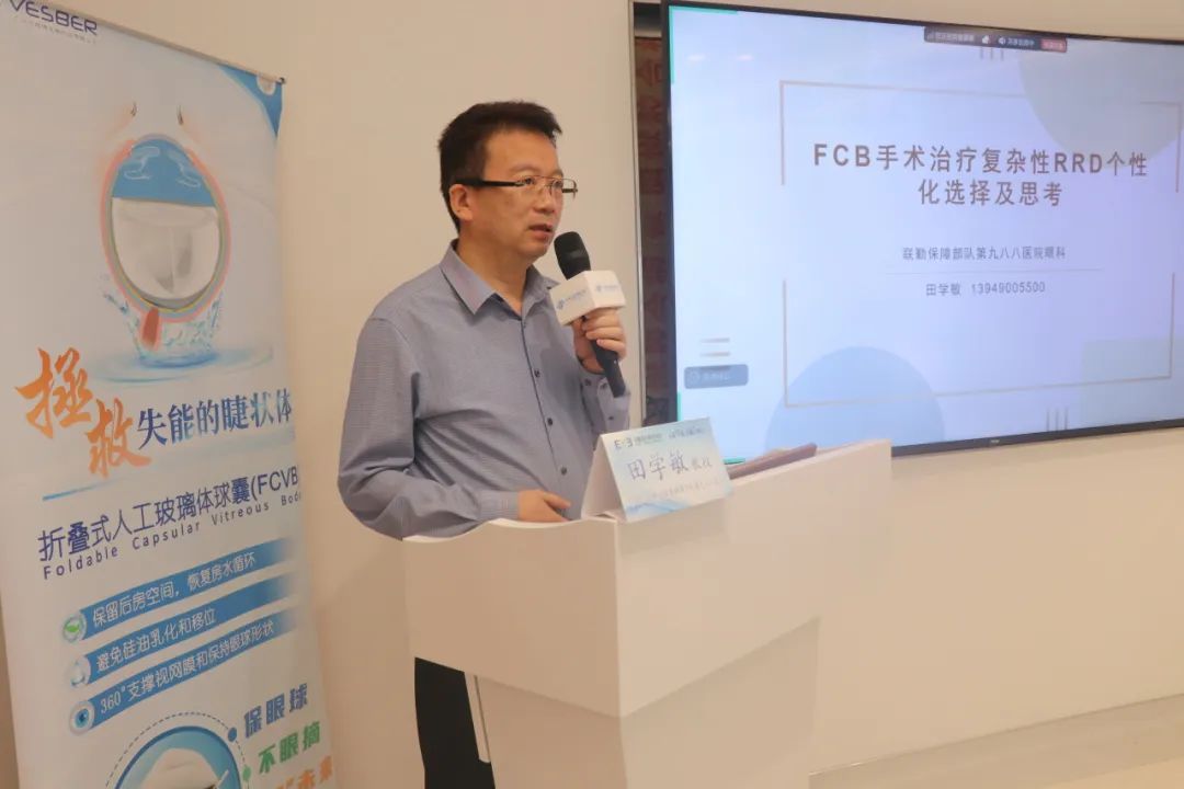 田学敏教授分享了《FCB手术治疗复杂性RRD个性化选择及思考》,在2025年3月之前采用FCB外加压患者共172例173眼:其中常规91眼、“6不+5不”82眼。FCB的临床应用主要是一个象限内2 PD的单个裂孔或3 PD的邻近多个裂孔,PVR-B级以下。个性化FCB手术要点:术前裂孔预定位、术中再定位,术中放液、注气、冷凝、缝合固定,避免球囊移位的措施,注意注水时机、注水量及其它要点。并分享了3例FCB治疗复杂性RRD病例。最后田教授总结到,虽然玻璃体手术技术日益发展为更多的复杂视网膜脱离患者提供了更多保留视力的机会,但FCB巩膜外加压术仍然具有其独特的优势。FCB外加压术治疗RRD,手术操作简单,学习曲线短,更加微创,组织损伤小,会让更多的RRD患者受益,给患者一个不做PPV的机会。手术成功的关键在于严格把握适应症、精细操作及术后管理。对于特殊类型复杂性孔源性视网膜脱离,个性化FCB治疗仍是较好的选择之一。FCB外加压术,一台医生做过就会爱上的手术方式。